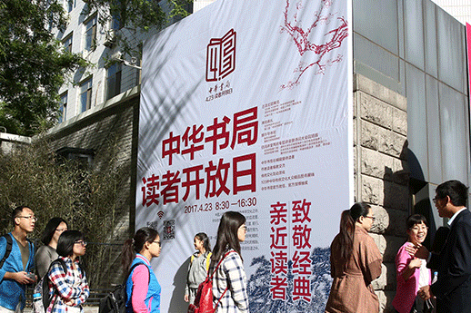而中华书局总经理徐俊像去年世界读书日一样,一直在大门口等候读者的到来,这是中华书局读者开放日的惯例,这样的惯例已坚持了四年。