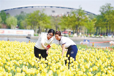 时至暮春,柳絮飞落,郁金香来。在市文化公园,郁金香盛开,市民徜徉花海间,乐享好春光。通讯员 冯涛 孙宝宇 记者 杨雅淇 文/图