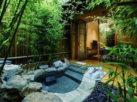 独具特色的竹叶露天汤池客房,庭院三面被翠竹环绕,坐进汤池中,沉浸在汤泉的温热水流中,抬眼便是满目葱绿竹叶,鸟鸣声四起,待在屋子里独享清静。