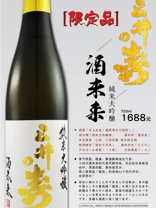 磨砂瓶,严选拥有“酒米之王”美誉的山田锦米为原料,精米步合40 %,磨去了60%的米哦!在醉寒冷的冬季低温发酵熟成的大吟酿(寒乃藏),纯净的如永不熄灭的信念,就好像三井寿永不放弃的坚持!如果说三井寿14号纯米大吟酿让你感受到的是热血与激情,那么这款大吟酿便该是“不变的激情”,还有温暖。