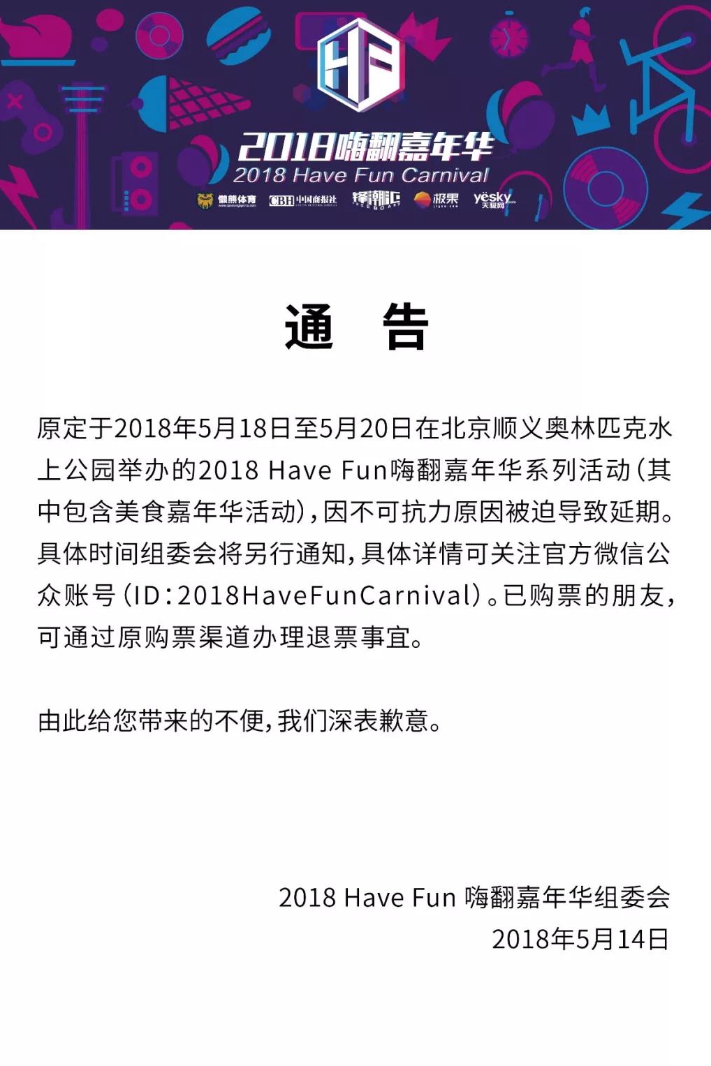 原定于2018年5月18日至5月20日在北京顺义奥林匹克水上公园举办的2018 Have Fun嗨翻嘉年华系列活动(其中包括美食嘉年华活动),因不可抗力原因被迫导致延期。具体时间组委会将另行通知,具体详情请关注官方微信公众账号(ID:2018HaveFunCarnival)。已经购票的朋友,可通过原购票渠道办理退票事宜。