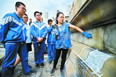 昨天上午,故宫太和殿前,30余名初中生在专家指导下,学习石质文物保护相关知识,亲身体验清洗石质文物的全过程。