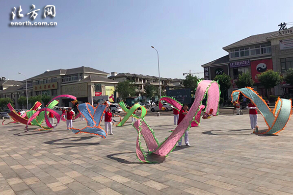 在米立方,徒步队员们共同参与组成了“519米立方”造型,小站空竹队员集体舞动手中的空竹龙,场面十分壮观。寓意着每一个人都是文明旅游、创建文明城区的实践者,用行动表达自己的决心。