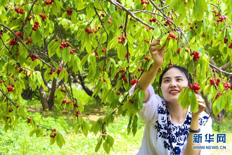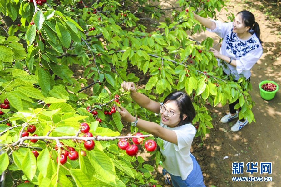 5月18日,游客在永清县养马庄乡汪家营村采摘樱桃。 5月以来,河北省永清县养马庄乡汪家营村种植的樱桃进入成熟期,包括红灯、大紫、早大果等十几个优质品种,吸引很多游客前来采摘、游玩。新华社记者 李晓果 摄
