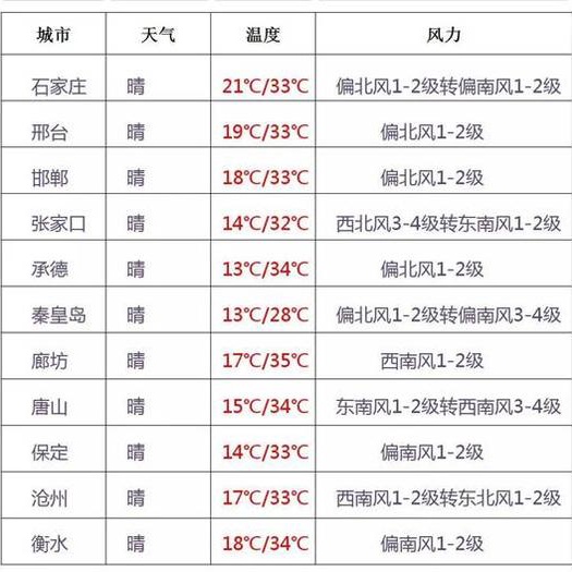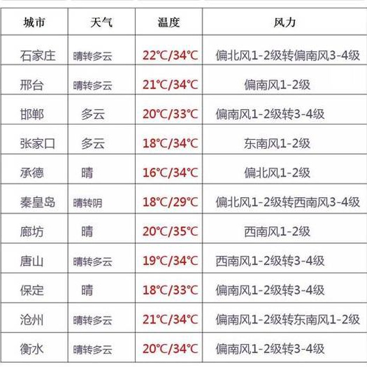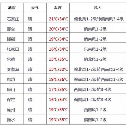 从气温具体来看,5月31日,北部设区市(张家口、承德、唐山、秦皇岛)最高气温为28℃至34℃,中南部设区市为33℃至35℃。6月1日,北部设区市最高气温为30℃至35℃,中南部设区市为34℃至36℃。2日,北部设区市最高气温为29℃至34℃,中南部设区市为33℃至35℃。