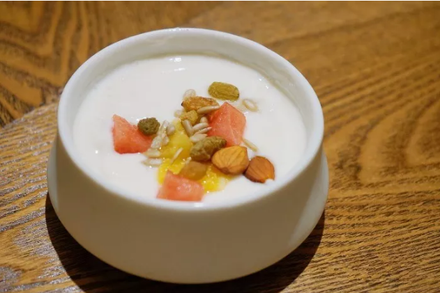 川贝梨膏酸奶,川贝梨膏甜滑清爽,还特意放入了坚果、西瓜调味,酸奶甜度中等,不稠不稀,比果冻还要清散一些,最适合饭后小食,解腻清口。