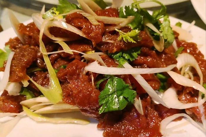 烤牛肉,烤牛肉是招牌菜,牛肉已经充分腌制过了,烤完后还可以根据自己的口味,加上些孜然面、辣椒面之类的。