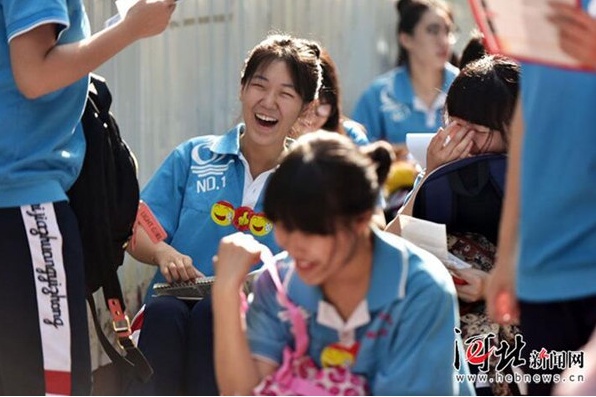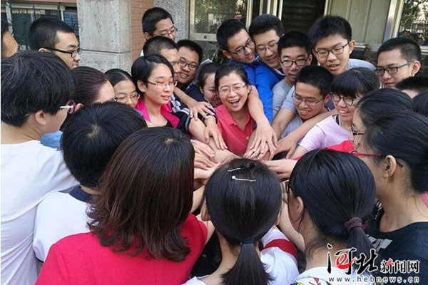 8点30分,石家庄市第15中学。进场前考生们互相加油打气。