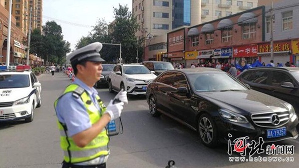 7点50分,石家庄市第43中学。由北向南方向出现轻微的拥堵情况,交警正在抓紧时间疏导。