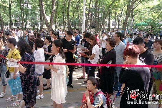 8点25分,石家庄市第2中学。考生们即将进场,师生们一起加油鼓劲。