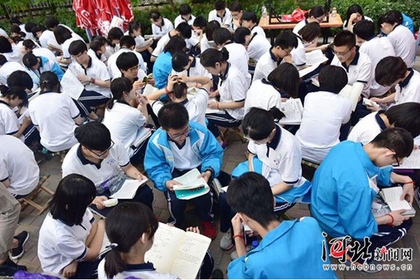 7点35分,石家庄市第15中学。考生们抓紧时间复习知识点。