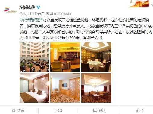 北京宝辰饭店地理位置优越,环境优雅,是个性价比高的老牌酒店,酒店很国际化,经常接待外国友人。北京宝辰饭店内三个各具特色的中西餐设施,无论百人华宴或知己小酌,都可令顾客各得其所。