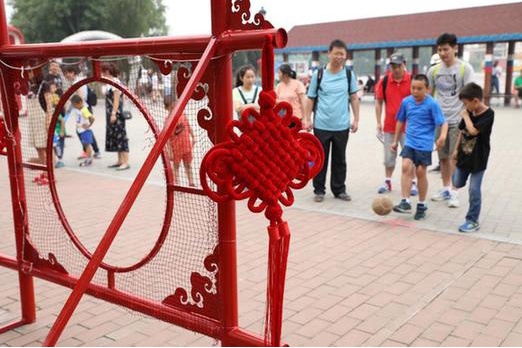 在公园里,与世界杯结合的“航母蹴鞠小小世界杯”活动,吸引了众多家庭的热情参与。仿古设计的蹴鞠门牌楼球门,更是成了很多游客合影留念的热门项目。“现在正是俄罗斯世界杯开赛期间,这周又是父亲节,我们将它们与端午节相融合,为游客提供一个独特的节日亲子互动平台,体验‘古代足球’与世界杯的趣味与欢乐,”航母负责人说。