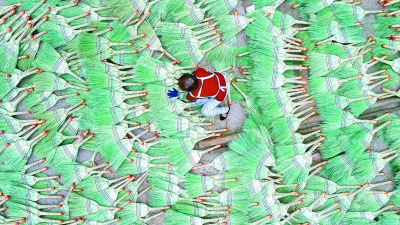 乐亭县毛庄镇永平笤帚专业合作社员工在晾晒扎制好的大笤帚。