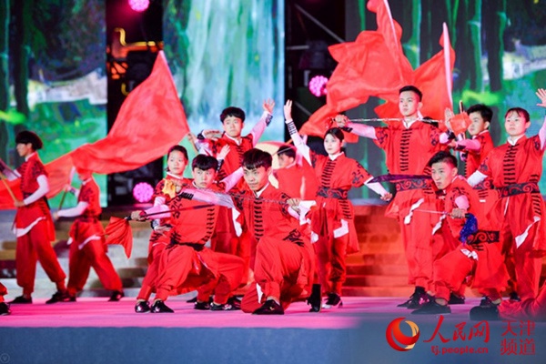 现场播放了天津旅游和甘肃旅游宣传片,之后进行了文艺演出。整台演出以“崇文尚武”为主题,通过演员们热情奔放的表演,展示了天津人文历史风韵,构筑了中国精神、中国价值和中国力量,彰显了“豪侠重义、恢弘磅薄”的武术风骨与“滨海之城、文武天津”的城市特色,传播了正能量。群舞《津武荣耀》、街舞《津门风采》、杂技《乘风破浪》、甘肃民族舞《敦煌乐舞·梵天》、歌舞《中国功夫》……一个个不同艺术表现形式的节目,充分表达了人民对祖国的热爱,全场不时响起热烈掌声。