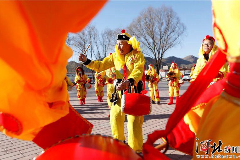 12月31日,张家口市宣化区四方台中心小学的学生们在王河湾挎鼓传承人贺海(前)的带领下表演挎鼓,迎接新年到来。