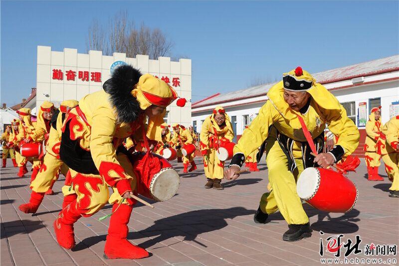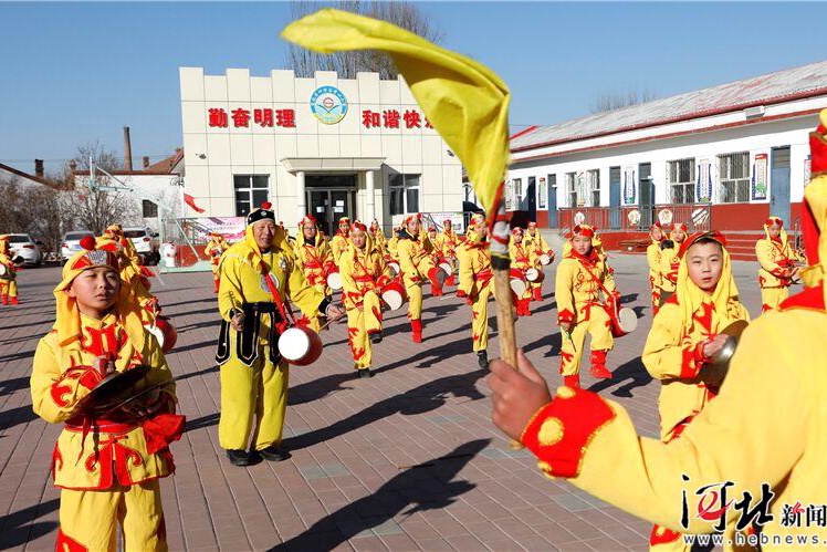 12月31日,张家口市宣化区四方台中心小学的学生们在王河湾挎鼓传承人贺海(左二)的带领下表演挎鼓,迎接新年到来。