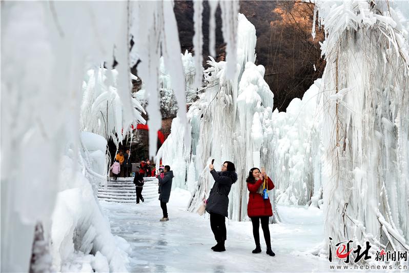 1月1日,游客在邢台天河山冰雪大世界冰瀑景观前拍照。由于持续的寒冷天气,邢台天河山风景区形成多处冰瀑景观,美丽的冰瀑吸引了众多游客前来观赏拍照。记者赵永辉摄影报道