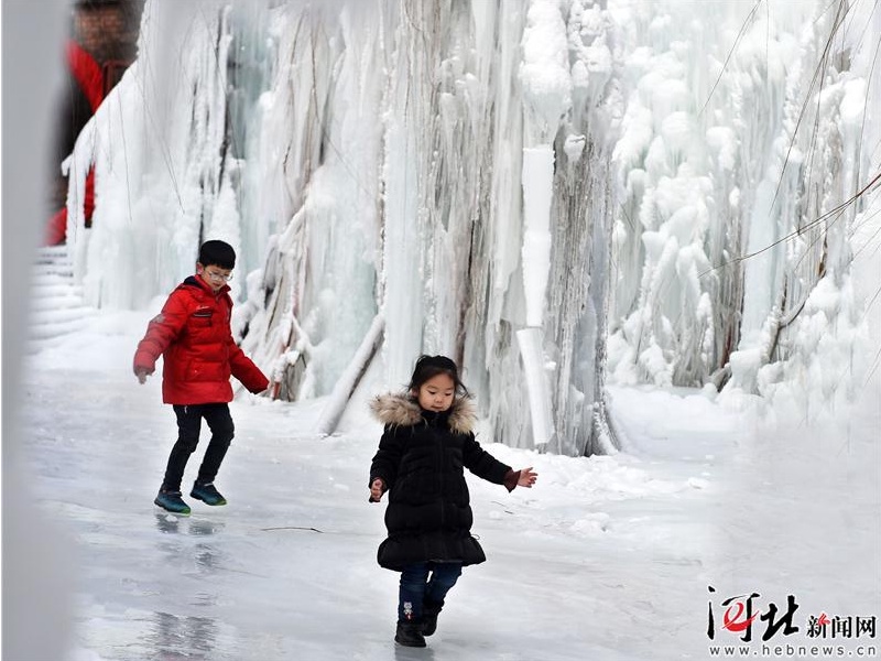 1月1日,两位小朋友在邢台天河山风景区冰瀑景观前玩耍。由于持续的寒冷天气,邢台天河山风景区形成多处冰瀑景观,美丽的冰瀑吸引了众多游客前来观赏拍照。记者赵永辉摄影报道