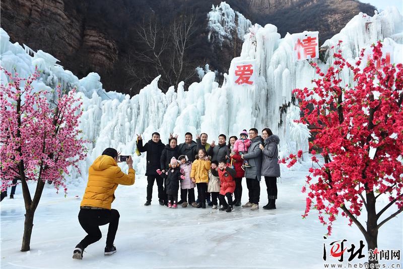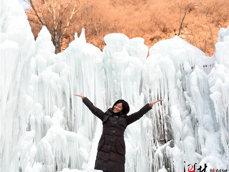 1月1日,游客在中国爱情山——邢台天河山冰雪大世界冰瀑景观前留影。由于持续的寒冷天气,邢台天河山风景区形成多处冰瀑景观,美丽的冰瀑吸引了众多游客前来观赏拍照。记者赵永辉摄影报道