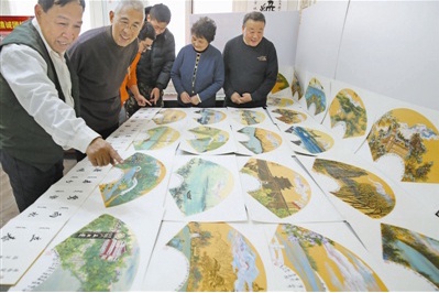 二十四节气扇面绘画作品是画家陈汝明结合天津著名的景点,对应不同的节气创作而成的。比如雨水节气的北宁公园,一轮红日当空照。你再看立春时节的望海楼,门前的小树刚吐出嫩绿的新芽,给人以生机勃勃之感。还有水上公园的立夏,这幅扇面取名为“水上眺远亭,立夏紫藤开”。二十四幅扇面,让参观者用最短的时间领略到津门春夏秋冬的美景。