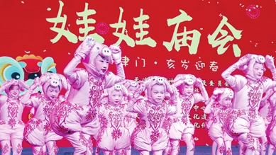 图 憨态可掬的“小猪崽”簇拥着舞龙舞狮队、吉祥如意的拜年话……周末,天津市青少年活动中心“津娃话年”娃娃庙会上演。“津味儿、津韵、津气神儿”让参与活动的家庭在“逛庙会”中,体验年的快乐,传承年的文化。本报记者 王倩 摄
