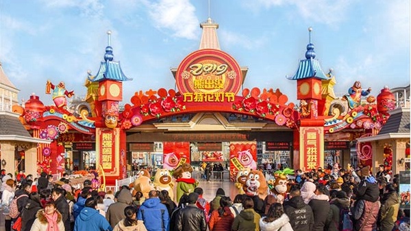 据悉,天津方特欢乐世界的花灯会以《熊出没》为主题,正门入口处的巨型拱门花灯——“恭贺新春”,自春节亮相以来便广受游客喜爱。它以艳丽喜庆的红色为基调,身着唐装的熊大、熊二、光头强凸显了节日氛围,蹦蹦、吉吉、毛毛等动漫角色栩栩如生,夜晚亮灯后更显华美绚丽。
