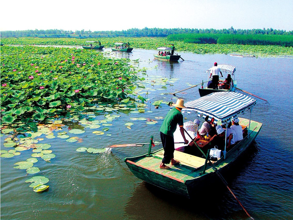 这里天空瓦蓝瓦蓝,清爽的空气像用水洗过一样。白洋淀卧在这片蓝下,铺陈着大片大片的绿,颜料一样浓稠,丝绸一般顺滑。绿得通透,绿得饱满,在阳光下晶莹剔透,像一块块天赐的翡翠,难怪有人说它是上天撒落在华北平原的一串珍珠。