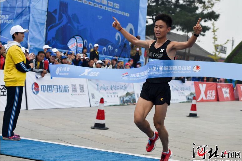 10月20日,2019 秦皇岛天下第一关·长城国际马拉松在秦皇岛市山海关区举办。图为获得男子全程马拉松比赛冠军的罗广银冲过比赛终点。 记者赵杰摄