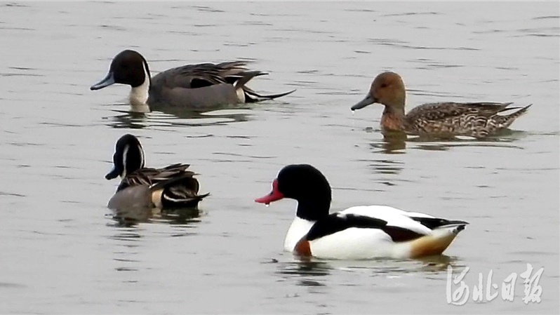 三只针尾鸭和一只翘鼻麻鸭在滹沱河栖息觅食。河北日报记者田瑞夫摄影报道