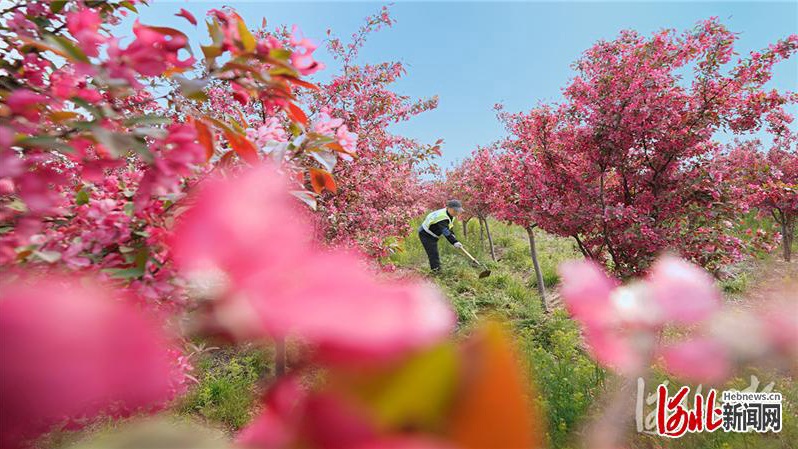 2020年4月8日,河北邢台经济开发区善北村农民在海棠树下劳作。河北省邢台经济开发区留村镇善北村500亩海棠花进入盛花期,把乡村田园装扮得如诗如画。 通讯员李院红摄影报道
