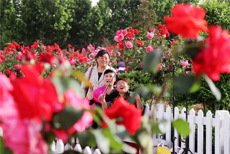 2020年05月11日,游人在河北广平县太极景观大道赏月季。通讯员杨海斌摄影报道