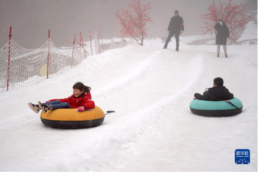 近日,小朋友在河北省邢台市天河山景区体验雪圈。
