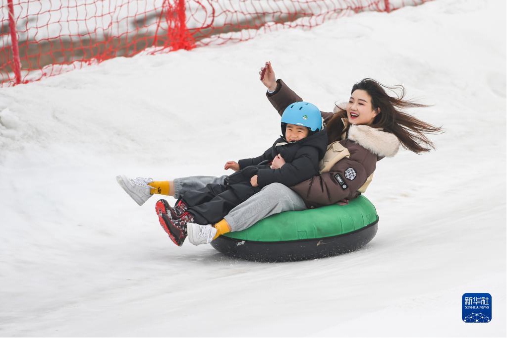 近日,游客在山东省青州市驼山滑雪场体验雪圈。