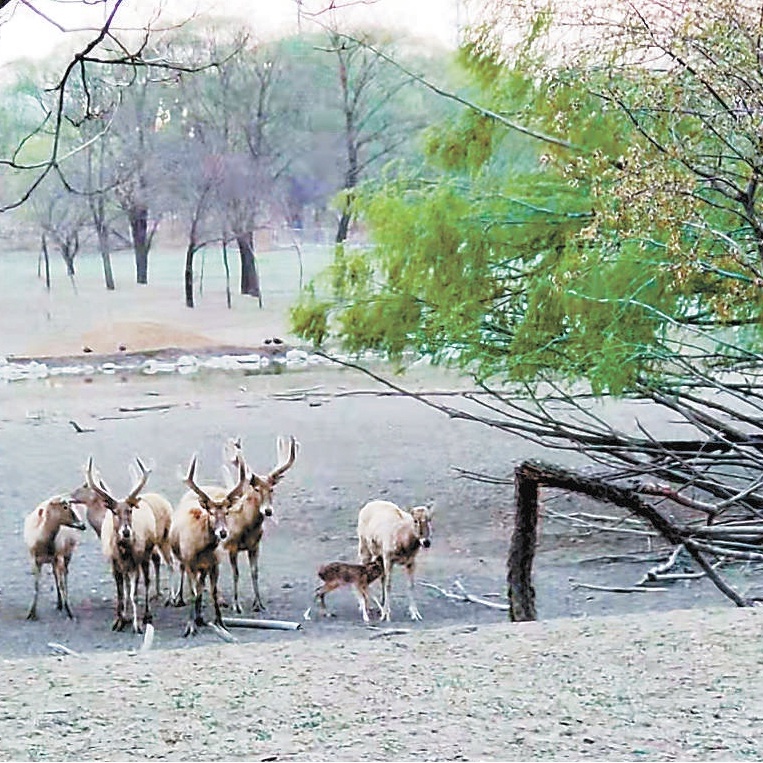 每到麋鹿产仔季,北京市科学技术研究院北京麋鹿生态实验中心的科研人员和饲养员会增加巡护次数,关注和记录新生仔鹿的数量和健康状况。4月7日上午,工作人员在巡视时发现,有只母鹿行为稍有异样:它并没有像往常一样前往投料点吃食物,而是远离鹿群,独自在麋鹿保护区的小土坡附近徘徊,并且十分警觉地关注着周围的环境,有时候还会抬起尾巴,伸着脖子向后舔腹侧的毛。