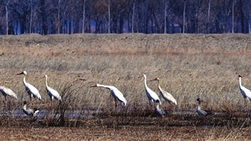 连日来,天津滨海新区官港森林公园湿地栖息着天鹅、白鹭、白琵鹭及各种雁鸭,其中,7只白鹤引人注目。据了解,白鹤是世界濒危鸟类之一。