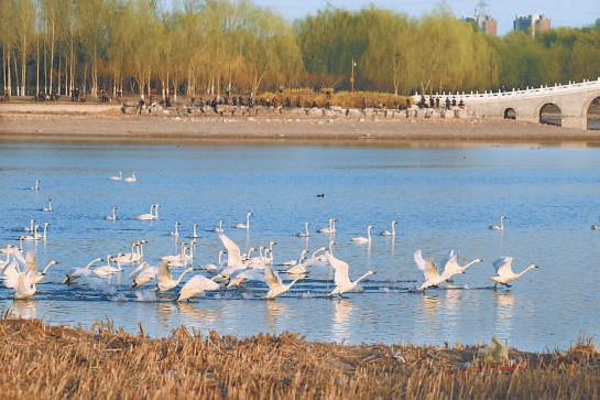 过境候鸟种类大体稳定,部分品种数量明显上升。“明显上升的如白头鹤、白枕鹤、白鹤、大鸨等。”李理介绍,官厅一带的白鹤种群数量已达到30多只。最近七八年,在官厅水库能稳定地观测到疣鼻天鹅,而且家庭越来越多、种群越来越大。“证明这个区域水质健康,生物多样性也是健康的。”李理说。