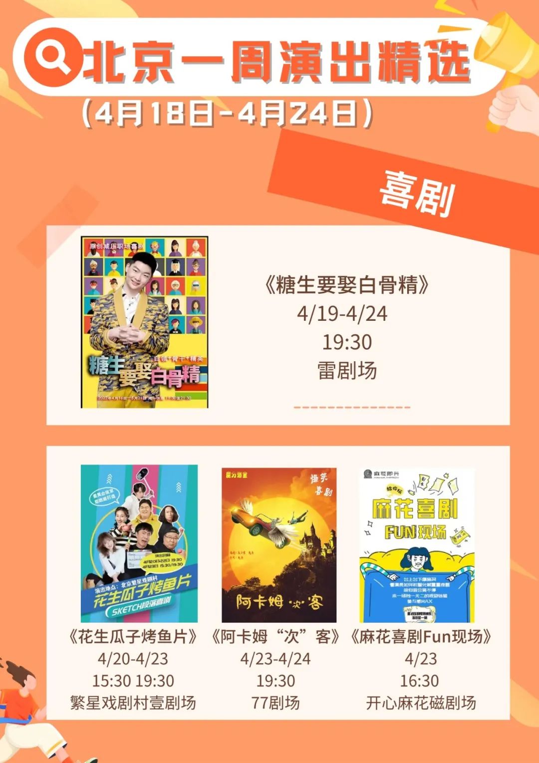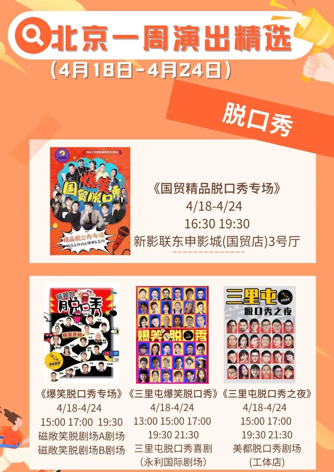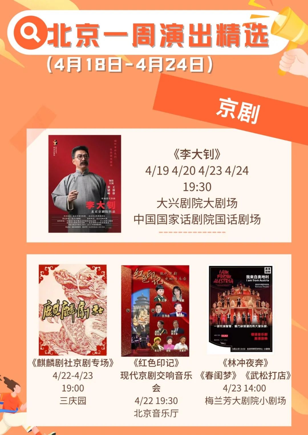 新的一周开启了,精彩好戏看不停。小北整理了北京商业演出节目单,包括喜剧、京剧、相声、脱口秀等,超多精彩演出等你来!了解更多精彩内容请戳:2022年4月18日—4月24日北京商业演出信息“出炉”。