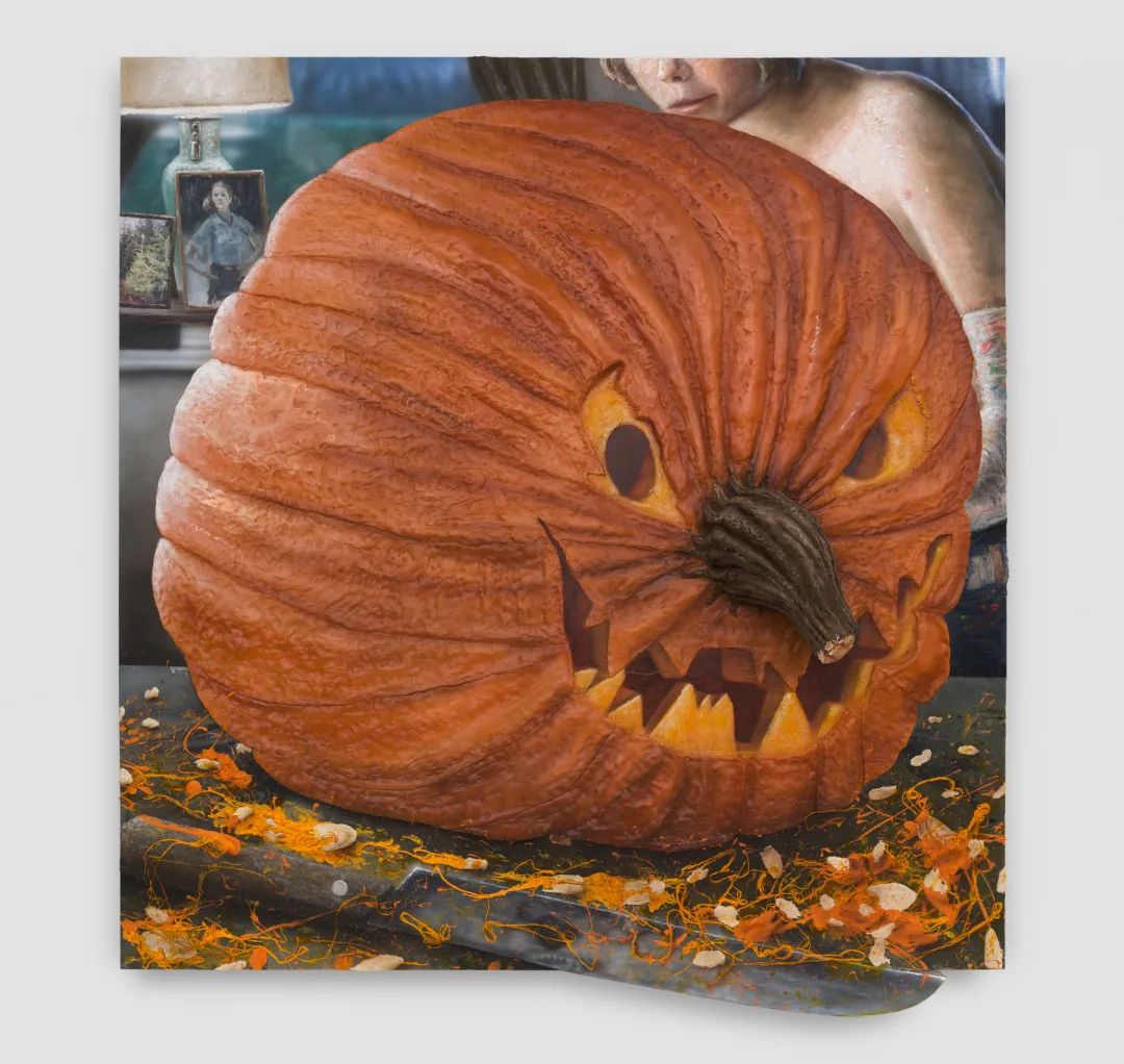 一只巨大的南瓜被雕刻出眼睛和嘴巴,它的鼻子伸出了画面,变成真实立体的实物。艺术家特睿·阿布德拉将生活物件与具象绘画语言结合,打破了绘画平面的限制。在作品《被掏空了》中,南瓜表面的纹路清晰可见,木板、泡沫塑料、牛仔布料等材料的使用,让绘画有了雕塑般的质感。