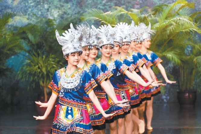 演出伊始,身着华服的著名琵琶演奏家赵聪走进油画般的彝族山水,在互动科技的“加持”下,纵情山水间的“4个她”奏响起不同的琴语,国风、流行、爵士、摇滚4个声部交融在油画质感的虚拟场景中,一幅如梦似幻的《彝族映象》缓缓展开;随后,正装优雅的爵士钢琴演奏家金野邂逅雕塑《Pianist月光》。在几座雕塑的静默环视中,一段即兴钢琴作品《爵士随想》温柔自在;遐思间,雕塑《舞》幻化成10位苗族少女,银饰叮当,踏乐而来……