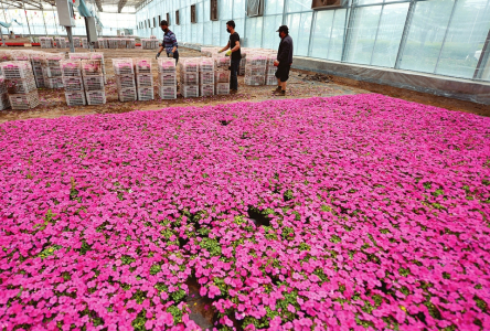 近日,太原市晋源区东街村山西康培现代农业科技产业园内,园林工人正在培育鲜花。如今,苗木花卉产业作为晋源区的特色主导产业,已成为当地农民增收致富的主要经济来源。