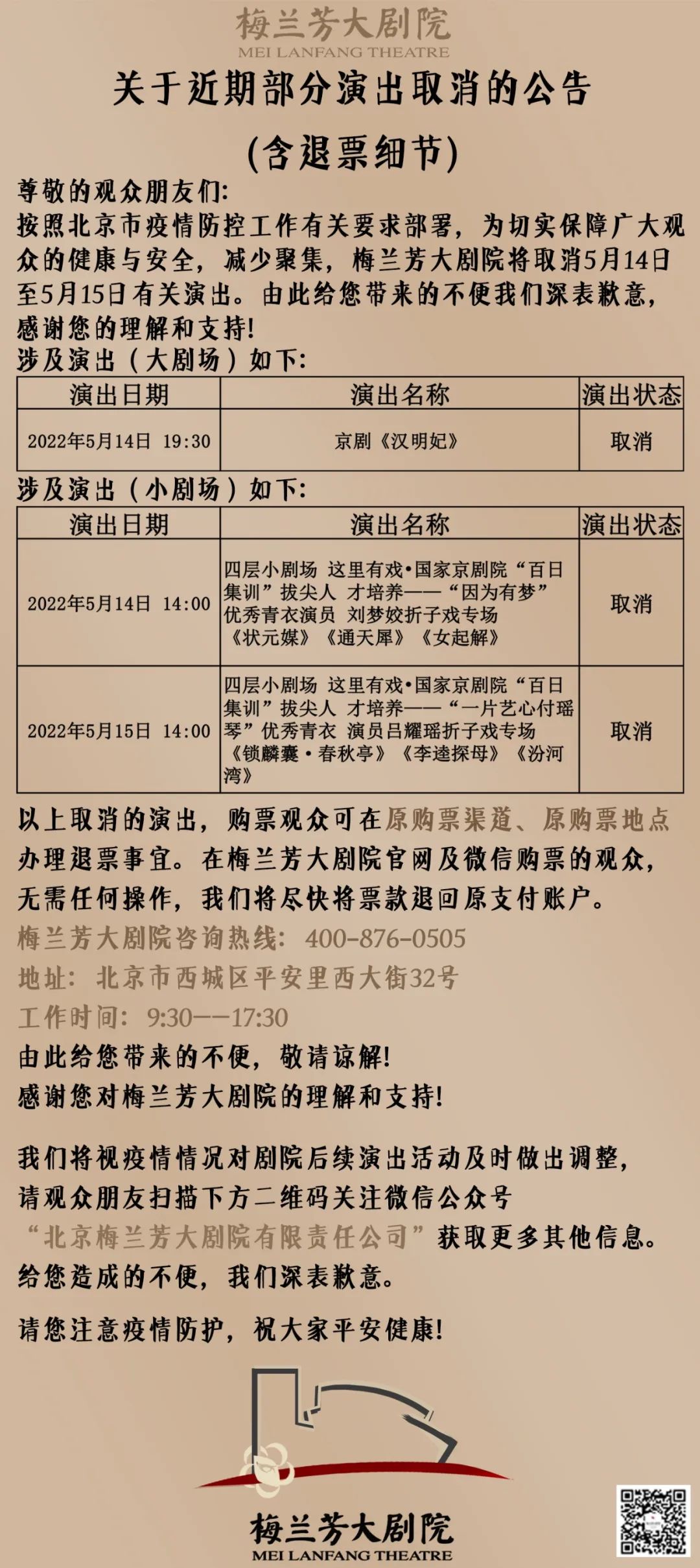 按照北京市疫情防控工作有关要求,为防止因大规模人员聚集引发的疫情传播,我院原定于5月13日-15日在全国地方戏演出中心小剧场、大剧场进行的演出取消,由此给您带来的不便我们深表歉意,感谢您的理解与支持!疫情期间也请大家积极配合防控措施,正确做好个人防护。