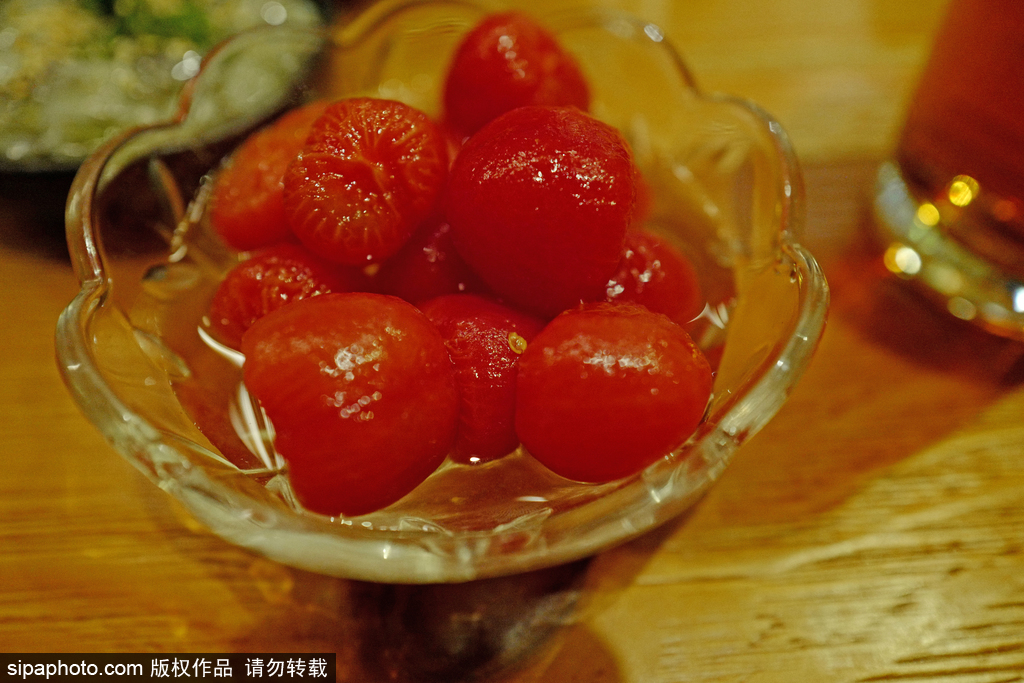 秘制小西红柿,每个小西红柿都剥了皮,是糖拌西红柿的味道。
