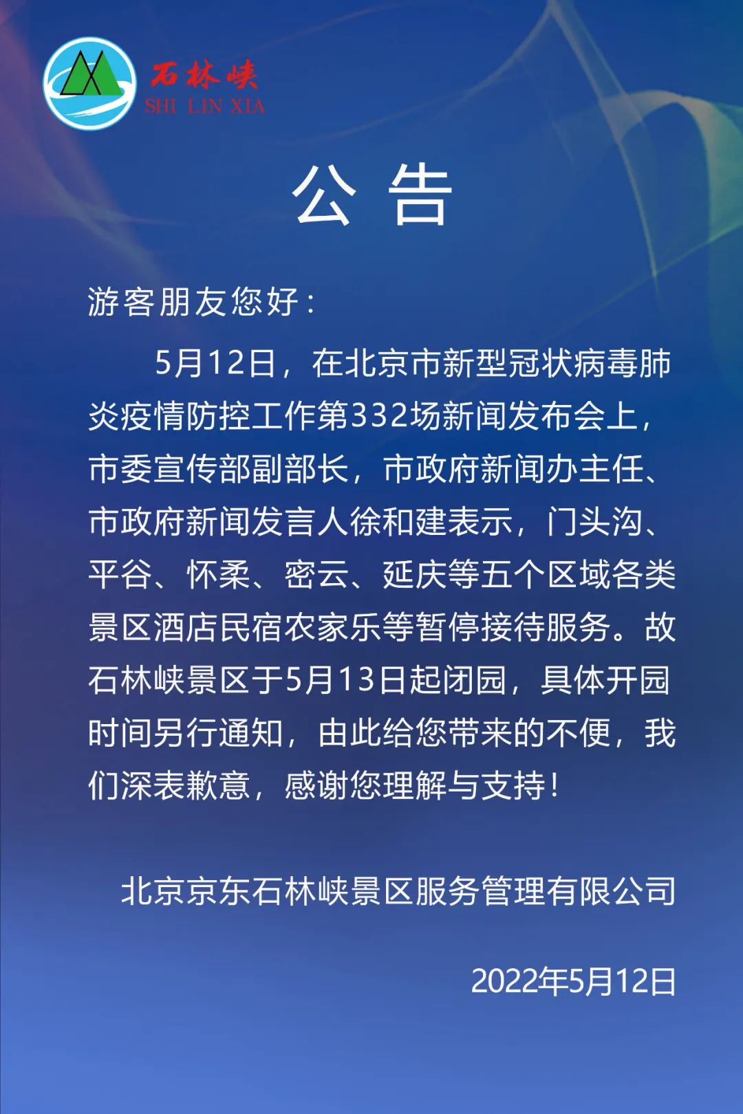 5月12日,北京平谷石林峡景区发布临时闭园公告,全文如下: