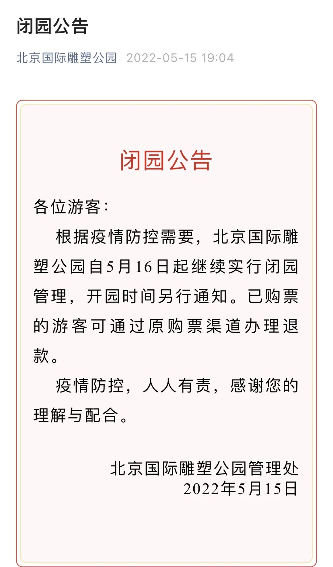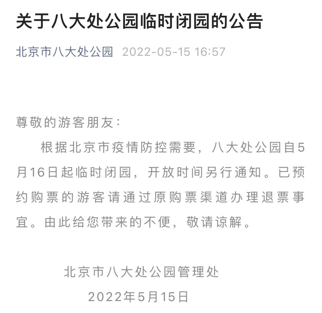 根据疫情防控要求,为保证游客身体安全,石景山区以下景区、公园、旅游街区暂停开放,具体开放时间另行通知,具体公告如下: