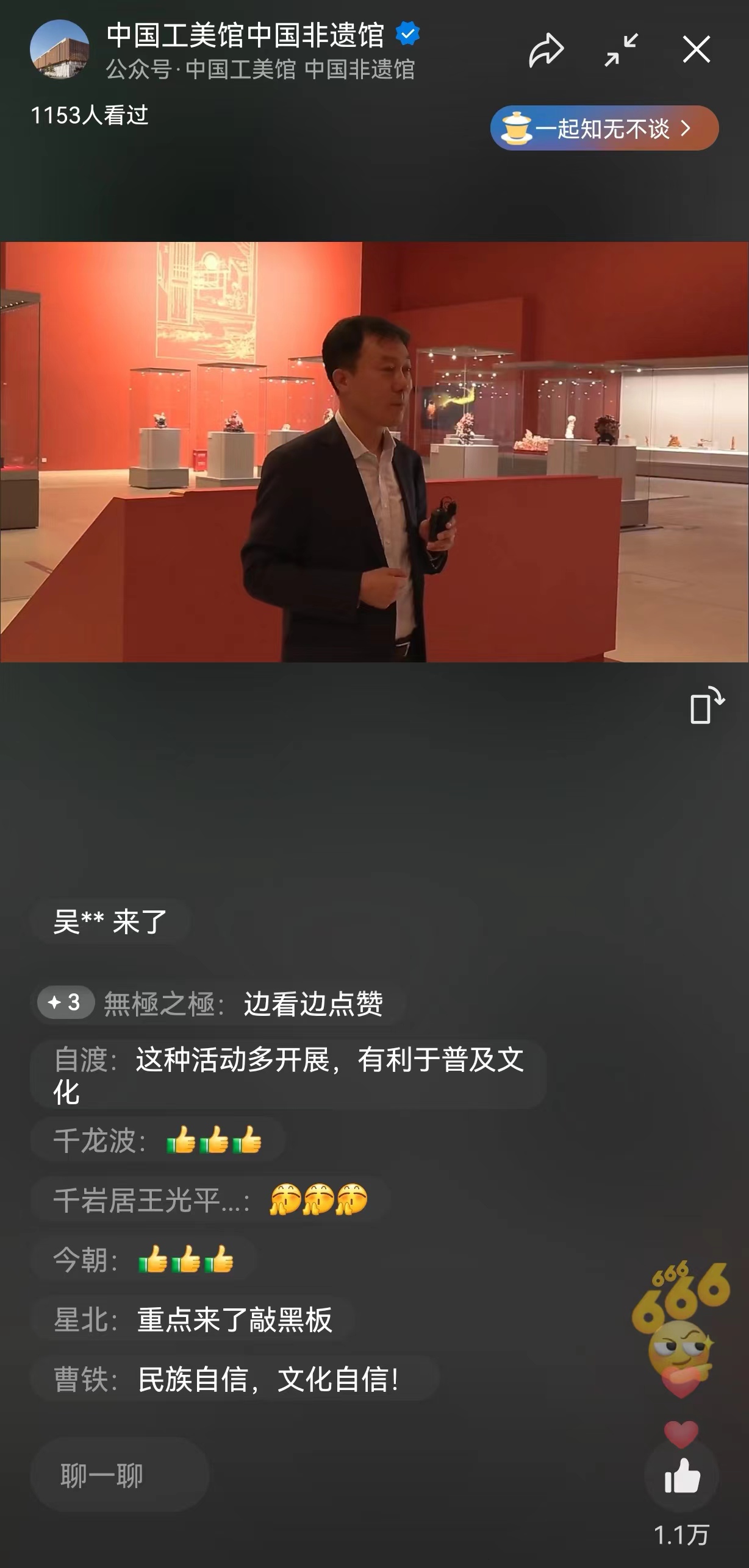 “翡翠四大国宝从1982年开始设计,到1990年完成,历时八年,集结了北京玉器厂的老中青40多位工匠……”昨天上午,中国工艺美术馆、中国非物质文化遗产馆的王辉、苏丹两位副馆长现身直播间,为观众介绍展馆的总体情况以及“大国匠作”展厅的珍贵展品。在讲到翡翠四大国宝受到国务院嘉奖的史实时,王辉副馆长还对着镜头展示了准备好的嘉奖令复印件,观众纷纷点赞。高清的直播画面近距离地展现了工艺美术杰作的细节,令大家惊叹不已。