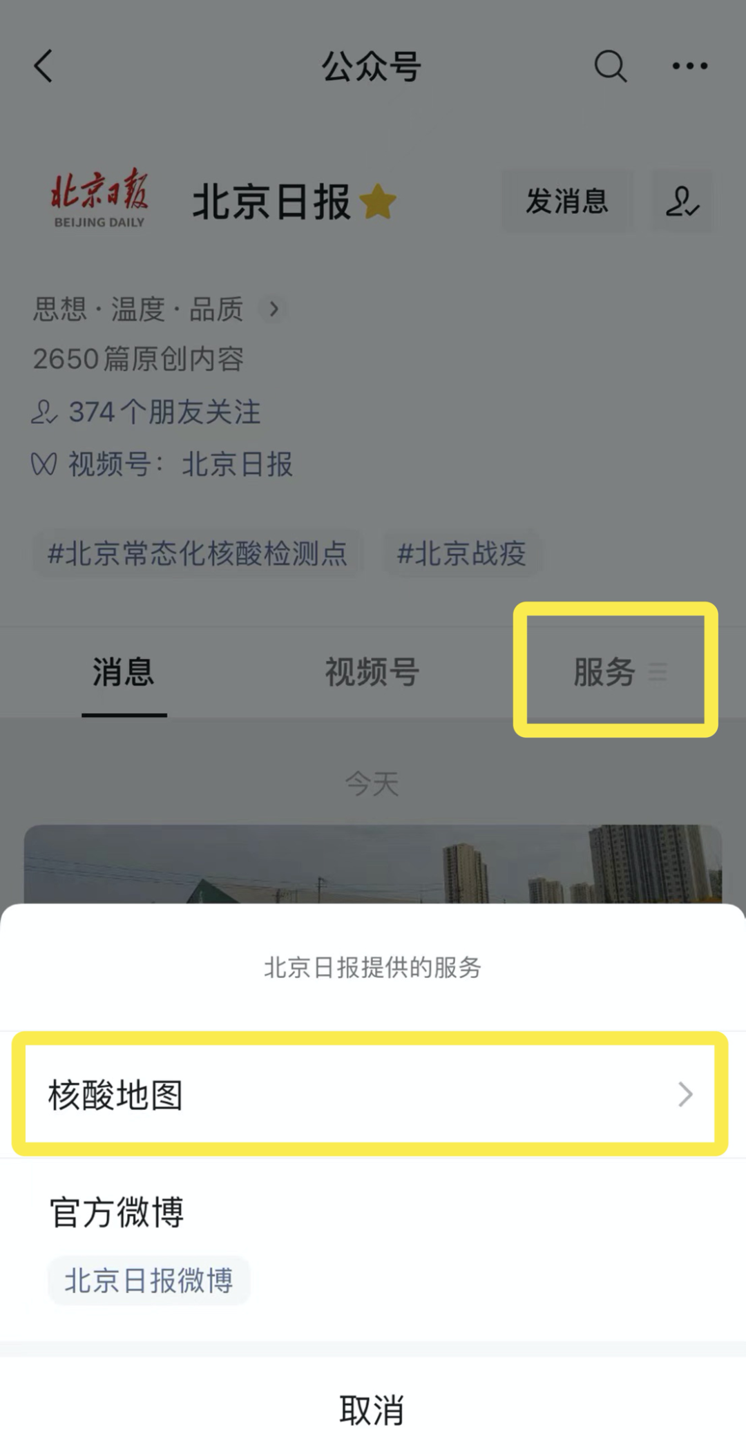 即日起,北京市民点击“北京日报”“北京晚报”“长安街知事”等微信公众号菜单栏,进入“核酸地图”,可以实现核酸检测机构查询、一键预约检测、报告查询等服务。微信搜索腾讯健康小程序,或者在微信菜单“我”-“服务”,进入“医疗健康”,也可使用核酸检测地图。
