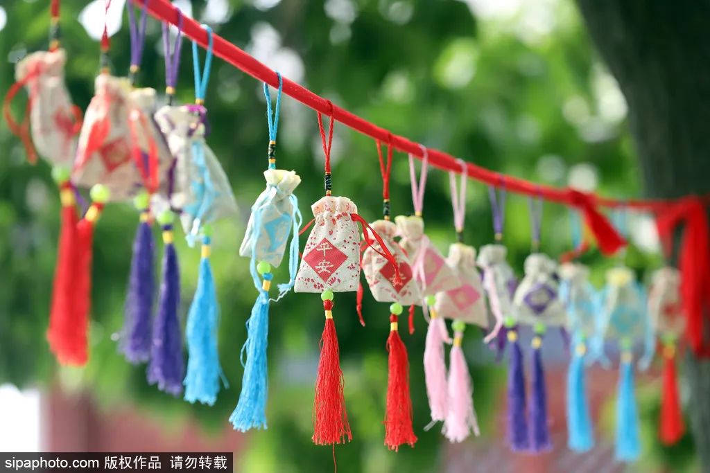 佩戴香囊是端午节的传统习俗,不但有辟邪驱瘟之意,更有襟头点缀之风。香囊中常会填充一些具有“芳香辟秽”功能的中药,可以提神醒脑、振奋精神、通九窍、防瘟病。