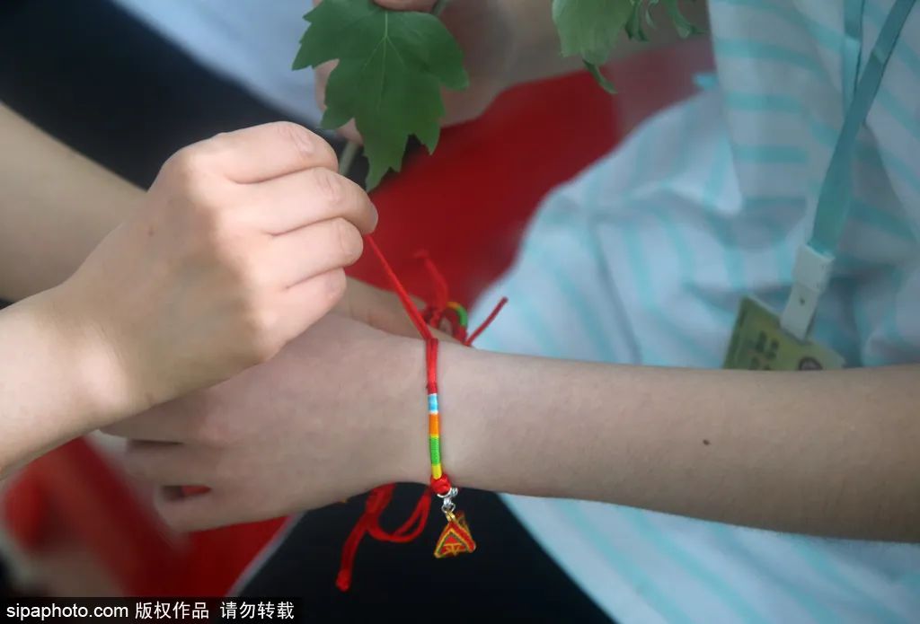 端午节清晨,大人起床后在孩子手腕、脚腕、脖子上拴五色线,五色代表吉祥,意为避邪避灾。“彩线轻缠红玉臂,小符斜挂绿云鬟。佳人相见一千年。”讲的就是这种习俗。