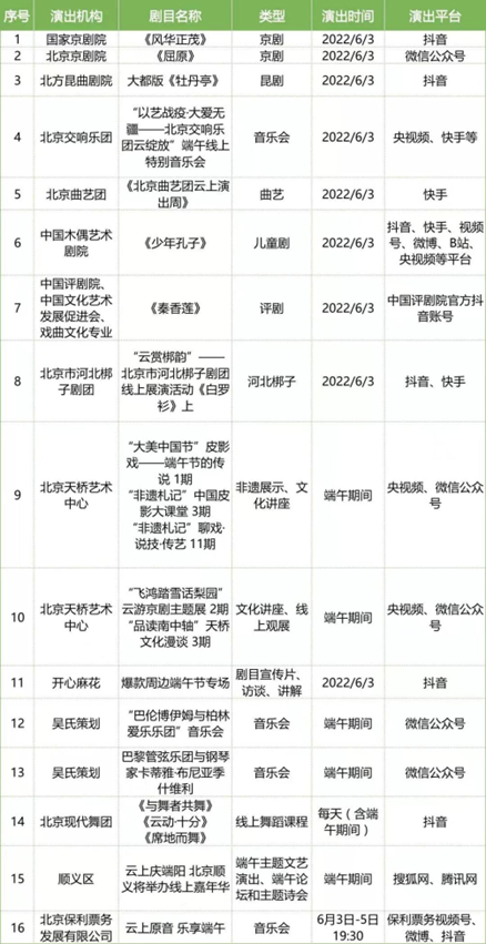 国家京剧院端午节当天在抖音线上演播现代京剧《风华正茂》。中国评剧院推出“云端演出周”系列活动,《秦香莲》《花为媒》《杨三姐告状》等经典剧目将在云端精彩亮相。北京市河北梆子剧团整个6月的“云赏梆韵”线上展演活动,端午期间推出《台城柳》《白罗衫》剧目演播。北京曲艺团在快手直播平台推出《北京曲艺团云上演出周》系列线上演出,包含相声、鼓曲等多种曲艺形式。北京民族乐团在国乐府公众号带来《国乐里的名著》,邀观众一起体验国乐魅力。国际文化交流品牌“吴氏策划”在端午期间推出柏林爱乐乐团、巴黎管弦乐团等世界知名交响乐团音乐会的线上高清放映,让音乐交流跨越国界。